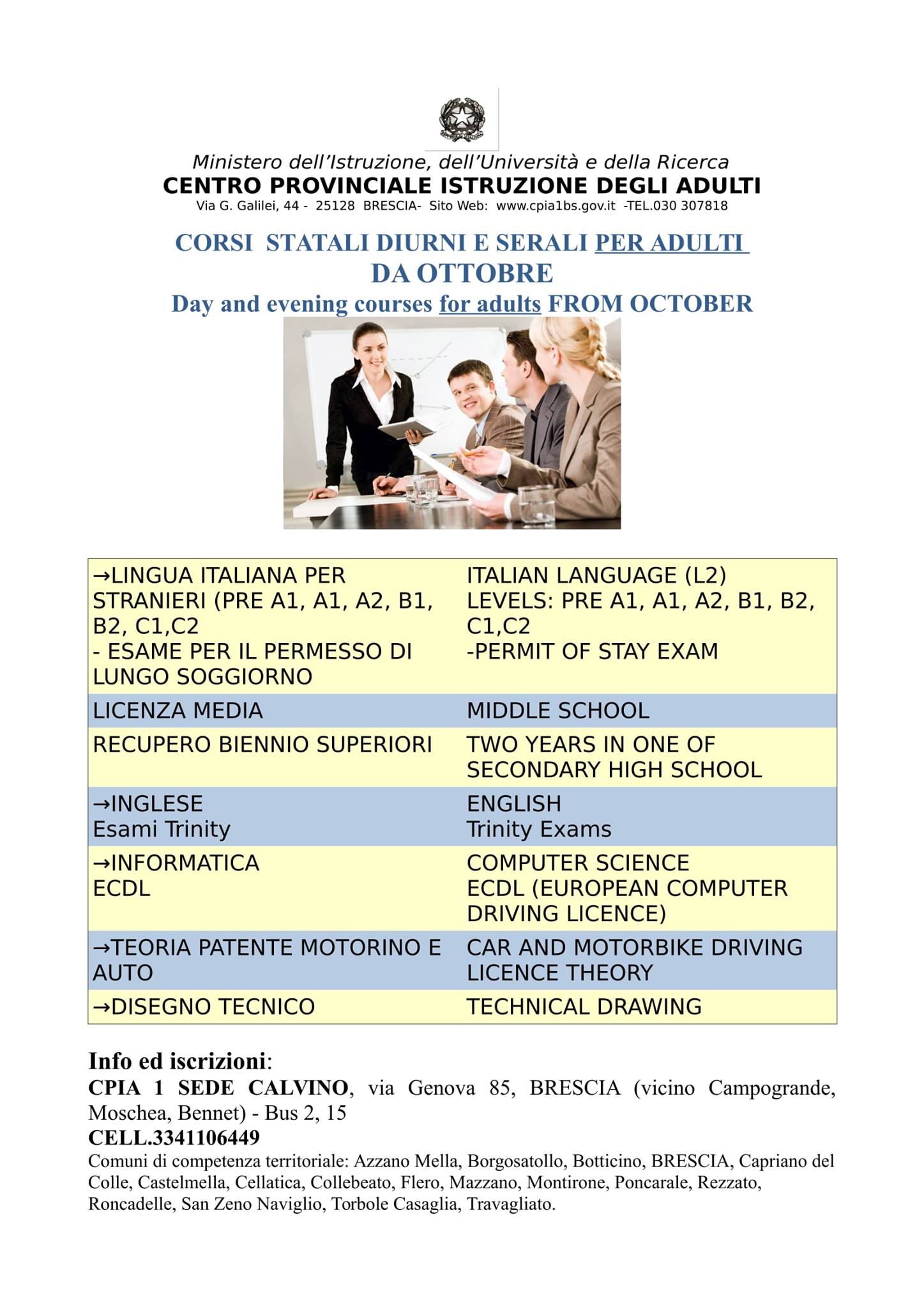 Sono aperte le iscrizioni ai corsi organizzati dal CPIA1 Brescia c/o la scuola